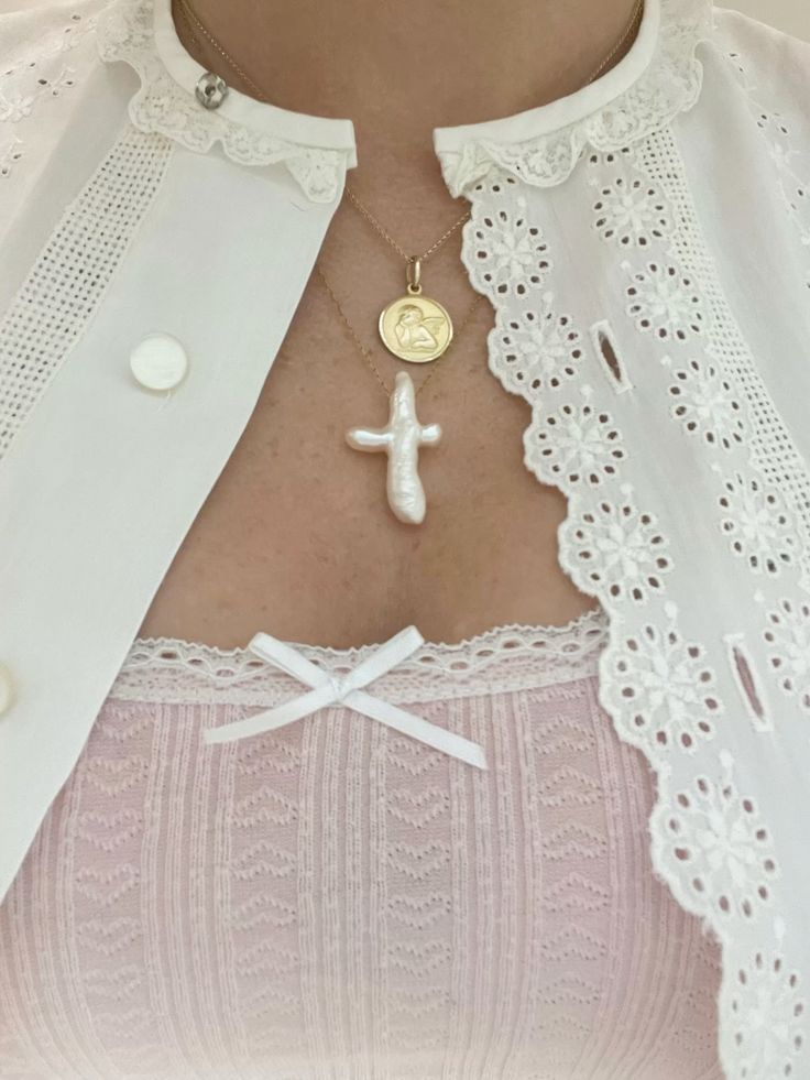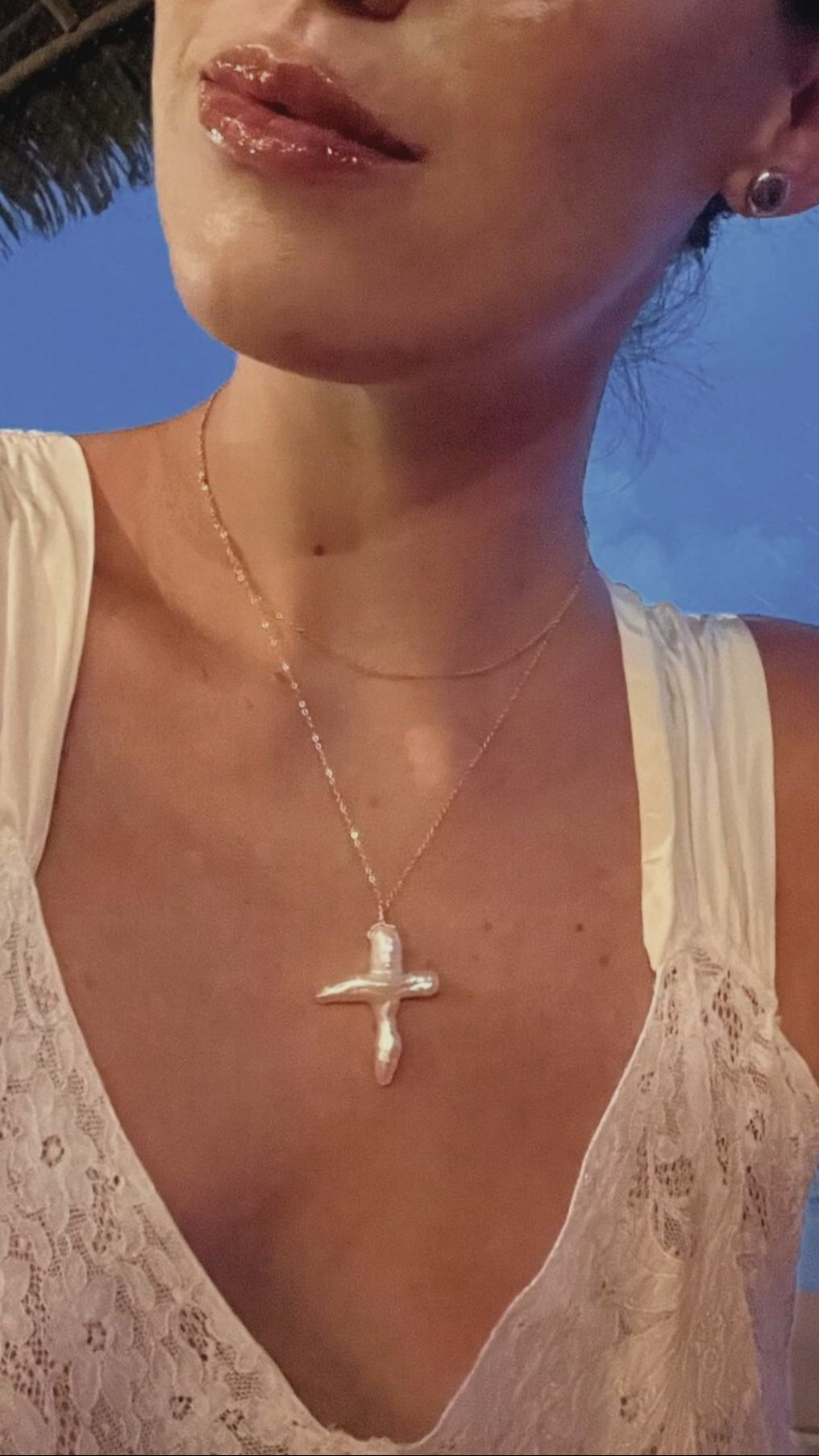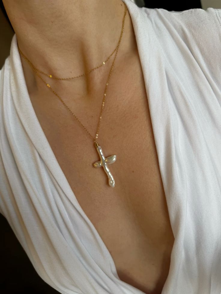 Our Freshwater Pearl Cross embodies graceful simplicity with a touch of divine charm. Featuring a delicate layered gold chain and a baroque-style pearl cross, this piece captures effortless Italian elegance. Its organic shape and lustrous finish make it perfect for both everyday wear and special moments — a symbol of faith, beauty, and timeless style.